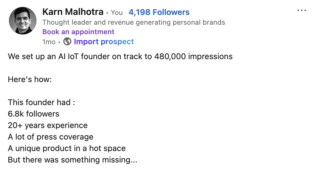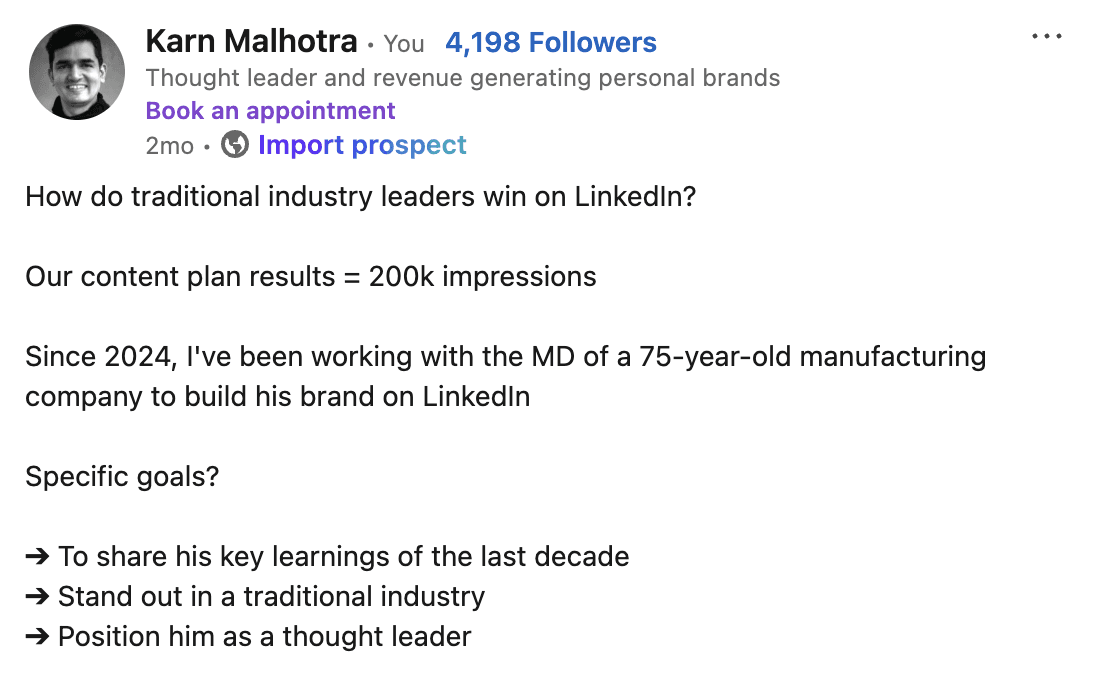 “I've been very happy with how Karn has guided me, with many posts going viral and what we share being in the Top 1% of thought leadership for the industry. The effort has been invaluable in achieving this progress."